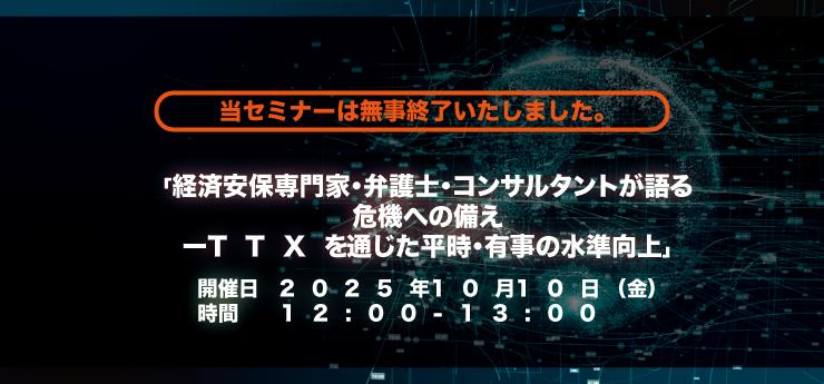 2025年10月10日に開催いたしましたセミナー「経済安保専門家‧弁護士‧コンサルタントが語る危機への備えーTTXを通じた平時‧有事の水準向上」にご参加いただき、