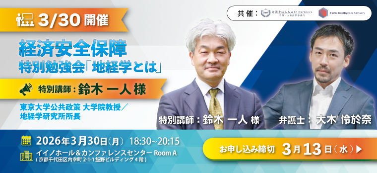 このたび、弁護士法人N&O Partners 名取・大木法律事務所(旧弁護士法人レオユナイテッド銀座法律事務所)とFortis Intelligence Advisory株式会社との共催および株式会社新領域安全保障研究所様にご協賛いただき、経済安全保障をテーマとした特別勉強会(協賛:INODS)を開催する運びとなりました。
