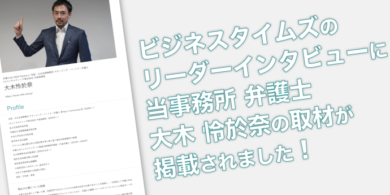 弁護士大木怜於奈のインタビュー記事が、ビジネス情報サイト「ビジネスタイムズ」のリーダーインタビューに掲載されました。…